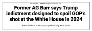 Cựu bộ trưởng Tư Pháp của Trump, ông Bill Barr, là người sau này nhiều lần công kích ông Trump, đã tố cáo vụ truy tố Trump là một chiêu trò chính trị ghê tởm -abomination-. Ông cũng đã nói thêm, theo ông đây hiển nhiên là một nỗ lực nhận chìm cuộc tranh cử TT của ông Trump, không hơn không kém.